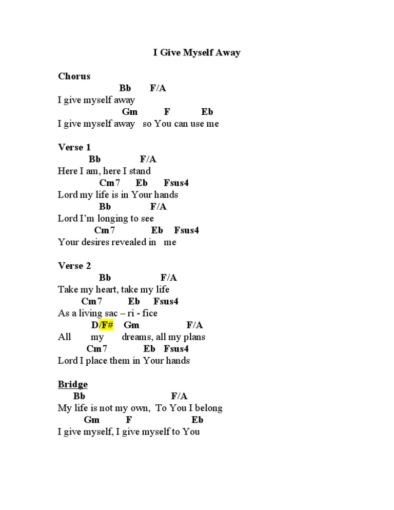 I Give Myself Away Lyrics And Chords - Songselect is the definitive source for worship song resources. I Give Myself Away Lyrics And Chords : C g/b here i am, here i stand f/c dm g lord, my life is in your hands c g/b lord, i'm.